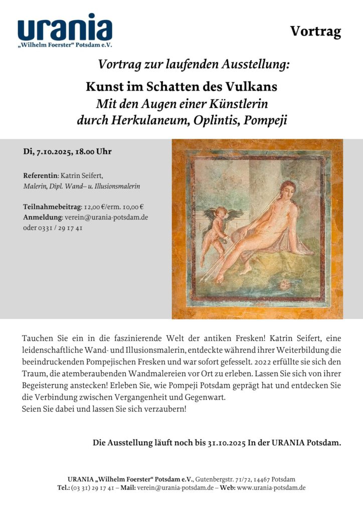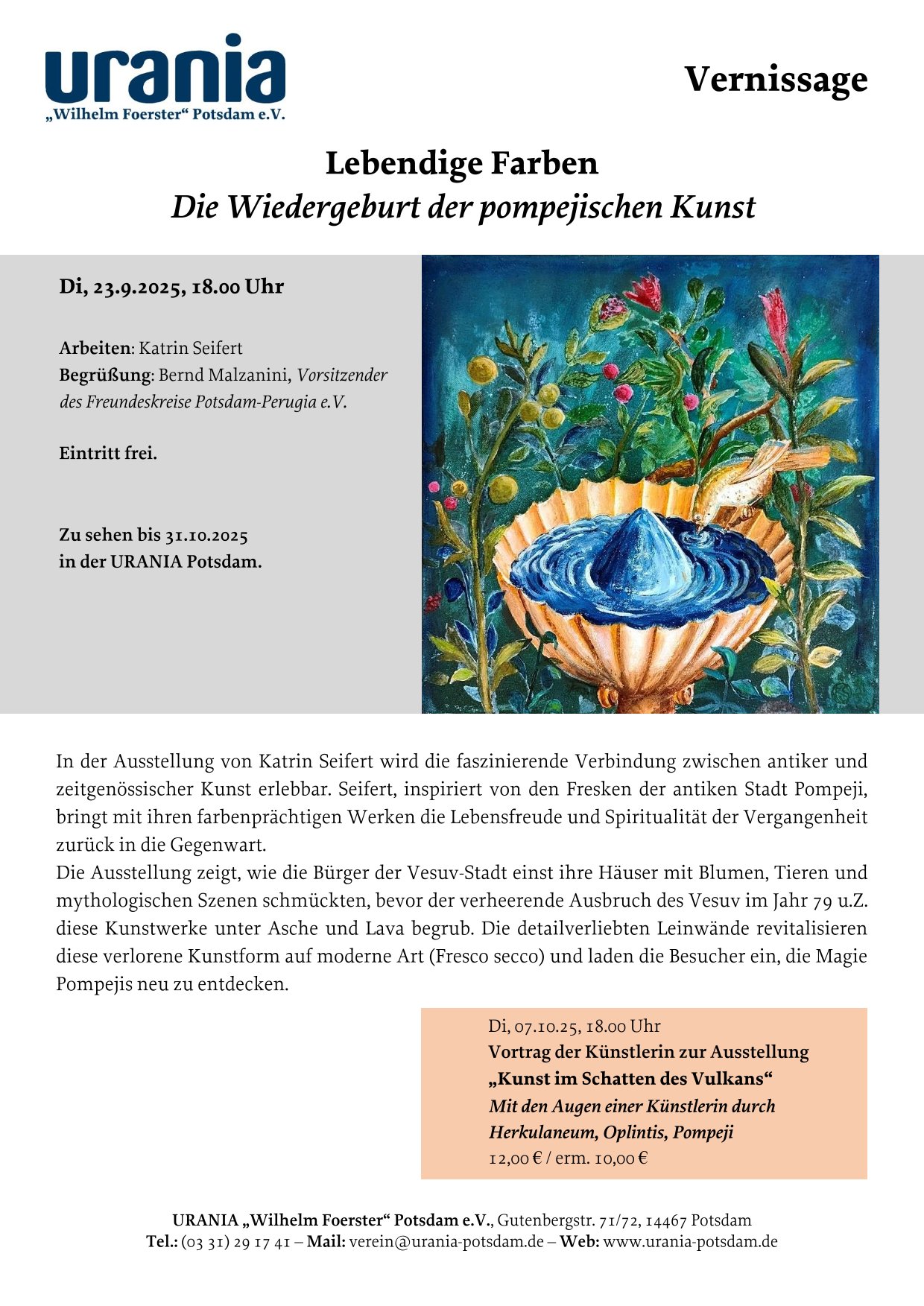 Während einer Weiterbildung zur Wand- und Illusionsmalerin stieß Katrin Seifert auf Pompejische Fresken und war sofort fasziniert. 2022 konnte sie sich endlich vor Ort von der Vielfalt und Schönheit der Wandmalereien überzeugen. Doch leider war vieles schon verblasst oder zerstört. So setzte sie sich das Ziel, diese Malereien als Fresco secco durch farbstarke Interpretationen wiederzubeleben. Diese sind gerade in der Urania Potsdam ausgestellt. Gehen Sie mit ihr auf Entdeckungsreise und lassen Sie sich von ihrer Bewunderung verführen. Denn Potsdam wurde vielfach durch Pompeji beeinflusst und gestaltet.